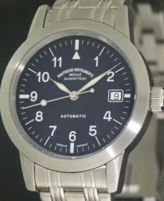 Muhle Glashutte German wrist watch from Muhle Glashutte Sports M12 series. Swiss ETA 2824-2 Automatic movement, solid 316L Stainless steel case with screw-down crown and case back, blue dial with date calendar, Arabic numerals and luminous hands, heavy duty sport metal band