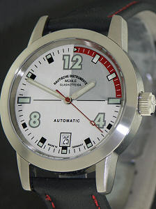 Muhle Glashutte Laser German wrist watch from Muhle Glashutte Sports M12 series. Swiss ETA 2824-2 Automatic movement, solid 316L Stainless steel case with screw-down crown and case back, white dial with 0-15 gray and red sector, date calendar, luminous Arabic numerals and hands, black leather watch band with red stitching. Available with metal bracelet.