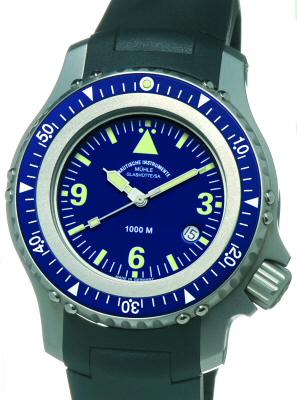 Muhle Glashutte Nautiche Instrumente Rasmus German diving watch with blue dial, 1000 meters water resistant. Swiss ETA Automatic movement with date calendar, solid 316L Stainless steel case with uni-directional rotating 0-60 bezel, black rubber band.