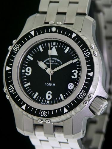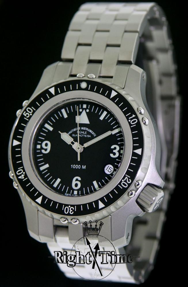 Muhle Glashutte Nautiche Instrumente Rasmus German diving watch with black dial, 1000 meters water resistant. Swiss ETA Automatic movement with date calendar, solid 316L Stainless steel case and watch bracelet, uni-directional rotating 0-60 bezel.