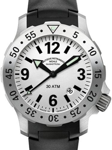 Muhle Glashutte Marinus I diving watch from Muhle Glashutte Nautical Line. 300 meters water resistant. Swiss ETA 2824 Muhle modified automatic movement with date calendar, sandblasted finish solid stainless steel case with black rubber band, rotating 0-60 metallic steel color bezel, silver color dial - makes the watch appear bigger with this bezel.