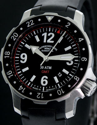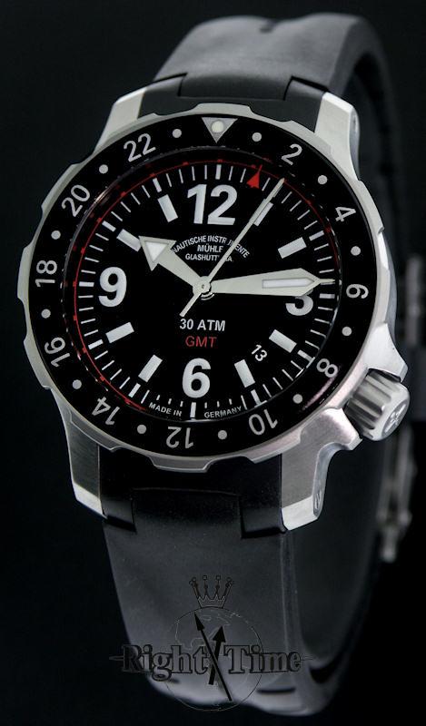 Muhle Glashutte Marinus GMT M1-28-53-MB diver model from Muhle Glashutte Nautical Line. 300 meters water resistant. Swiss ETA 2893 Automatic movement with second time zone indicator, date calendar, solid stainless steel case with black duo-directional rotating 24 hour bezel, black color dial, black rubber strap.