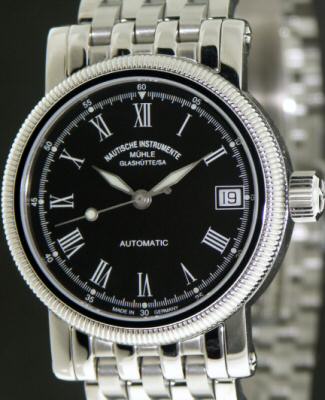 Muhle Glashutte Medium-I wrist watch model M1-31-63MB from Muhle Glashutte Classic-Line series. Swiss ETA 2842-2 Automatic movement, stainless steel case with coin edge bezel, black dial with Roman numerals and date calendar, stainless steel watch bracelet