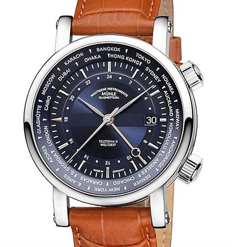 Teutonia II Weltzeit GMT M1-33-82-LB. Powered by Muhle`s heavily modified with "woodpecker" regulator and rotor SW 330-1 movement. Midnight blue sculpted dial with date and second time-zone hand. Bi-directional inner bezel with world cities as 3rd time-zone. Brown alligator style strap on deployant clasp