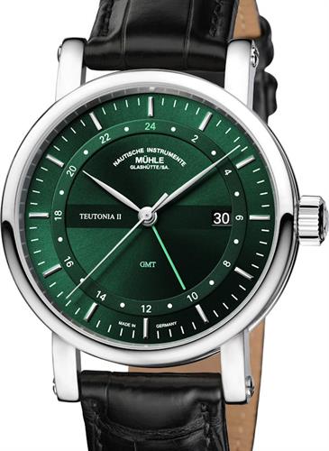 Teutonia II GMT M1-33-96-LB-I. Powered by Muhle`s version of SW330-2 movement with second time zone indicator and date. Green dial and thin steel hands. Black croco-print leather band