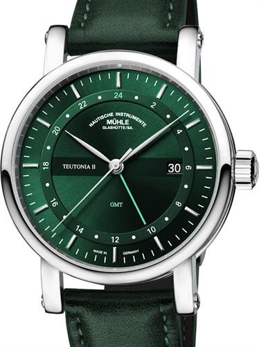Teutonia II GMT M1-33-96-LB-II. Powered by Muhle`s version of SW330-2 movement with second time zone indicator and date. Green dial and thin steel hands. Green leather band
