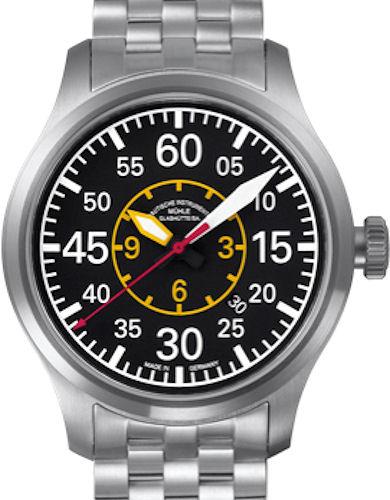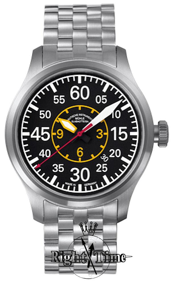 Muhle Glashutte Terranaut II watch powered by SW200 automatic movement with Glashutte made plates and patented woodpecker regulator. Large 44mm brushed stainless steel case, scratchproof sapphire crystal, screw down crown, see-through caseback, black "aviator" style dial with yellow color accents, luminous hands and markers, date calendar. Stainless steel bracelet