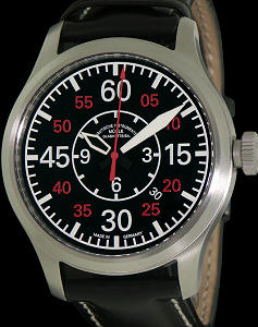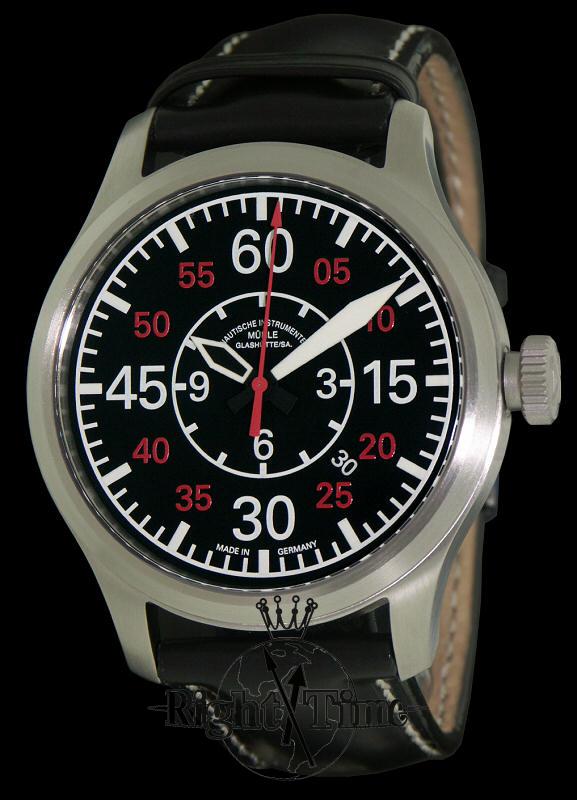 Muhle Glashutte Terranaut II watch powered by ETA 2824-2 movement with Glashutte made plates and patented woodpecker regulator. Large 44mm brushed stainless steel case, scratchproof sapphire crystal, screw down crown, see-through caseback, black "aviator" style dial with red color accents, luminous hands and markers, date calendar. Black leather band.
