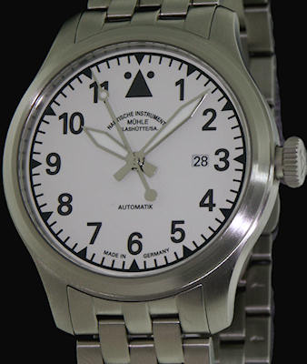 Muhle Glashutte Terrasport I watch powered by SW200 movement with Glashutte made plates and patented woodpecker regulator. Large 44mm brushed stainless steel case, scratchproof sapphire crystal, screw down crown, see-through caseback, white easy to read dial with extra large luminous steel hands, date calendar. Stainless steel bracelet