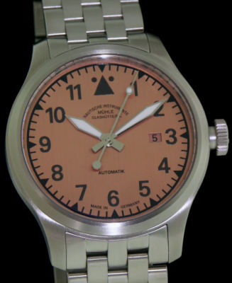 Muhle Glashutte Terrasport I watch powered by SW200 movement with Glashutte made plates and patented woodpecker regulator. Large 44mm brushed stainless steel case, scratchproof sapphire crystal, screw down crown, see-through caseback, metallic cooper dial with luminous hands and markers, date calendar. Stainless steel bracelet