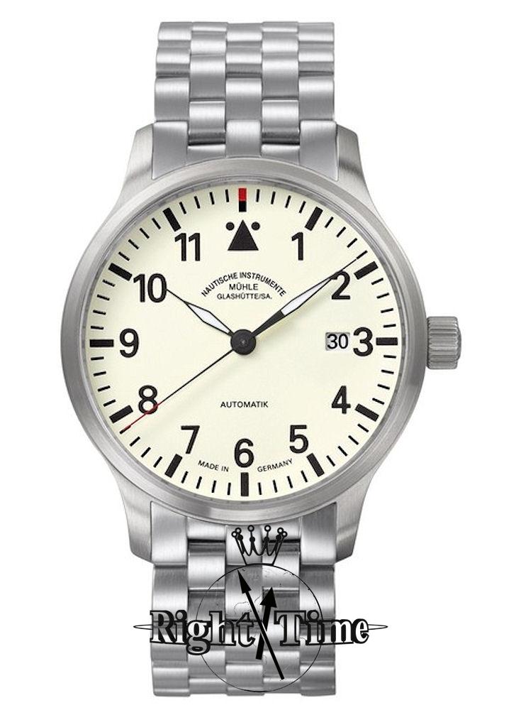 Muhle Glashutte Terrasport II watch powered by SW200 movement with Glashutte made plates and patented woodpecker regulator. 40mm brushed stainless steel case, scratchproof sapphire crystal, screw down crown, see-through caseback, ivory military dial with luminous hands, date calendar. Stainless steel bracelet