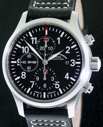 Muhle Glashutte TerraSport I chronograph watch powered by Muhle version of popular ETA/Valjoux 7750 chronograph movement, with Glashutte made plates and patented woodpecker regulator. Large 44.5mm brushed stainless steel case, scratchproof sapphire crystal, screw down crown, see-through caseback, black dial with white sub-dials, luminous hands, markers, day/date calendar. Black leather band.