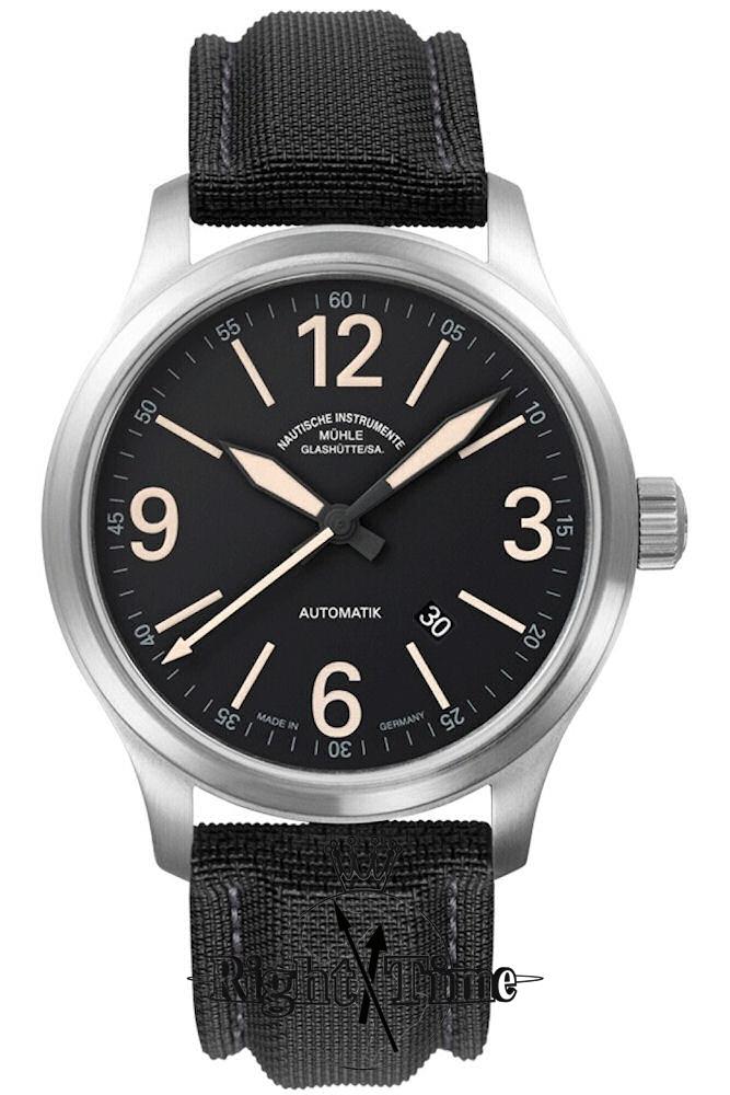 Muhle Glashutte TerraNaut II Trail model powered by 26 jewels SW200 movement with Glashutte made plates and patented woodpecker regulator. Large 44mm brushed stainless steel case, scratchproof sapphire crystal, screw down crown, see-through caseback, black dial with cream luminous hands and markers, date calendar. Black synthetic strap