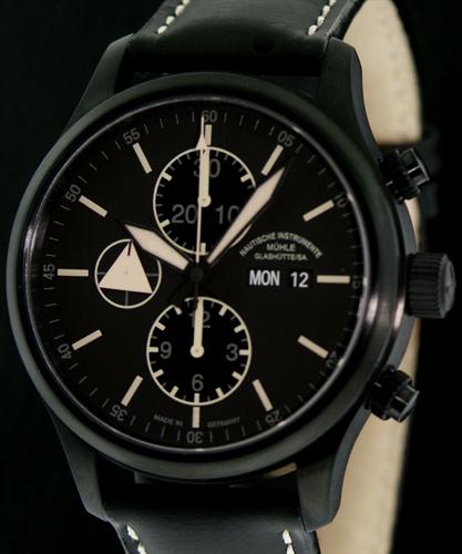 Muhle Glashutte Terranaut I Trail PVD chronograph watch powered by automatic chronograph movement with Glashutte made plates and patented woodpecker regulator. Classic 44mm stainless steel case, scratchproof sapphire crystal, screw down crown, see-through caseback, black dial with luminous hands and markers, day/date calendar.
