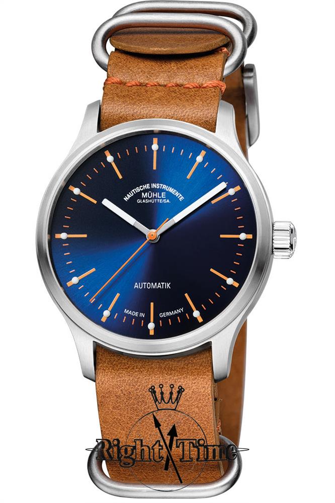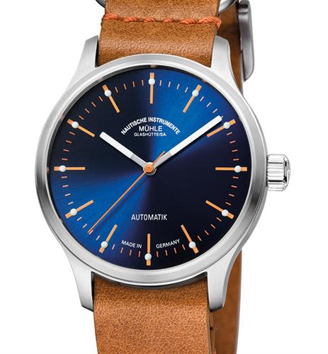 Muhle Glashutte Panova Blau model powered by 26 jewels SW200 movement with Glashutte made plates and patented woodpecker regulator. 40mm brushed stainless steel case, scratchproof sapphire crystal, screw down crown, blue dial with orange accents and luminous hands and markers.