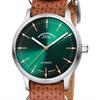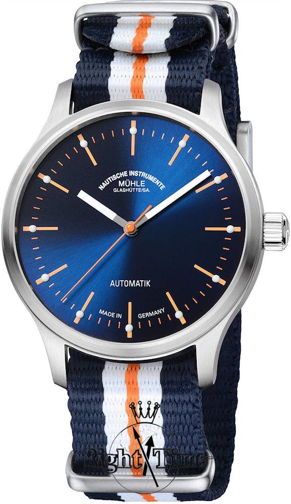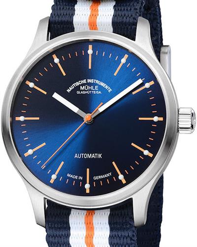 Muhle Glashutte Panova Blau model powered by 26 jewels SW200 movement with Glashutte made plates and patented woodpecker regulator. 40mm brushed stainless steel case, scratchproof sapphire crystal, screw down crown, blue dial with orange accents and luminous hands and markers.