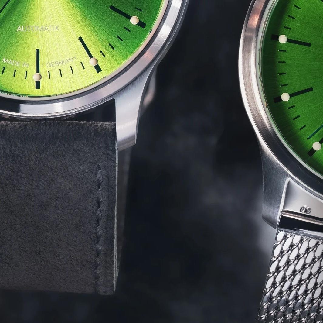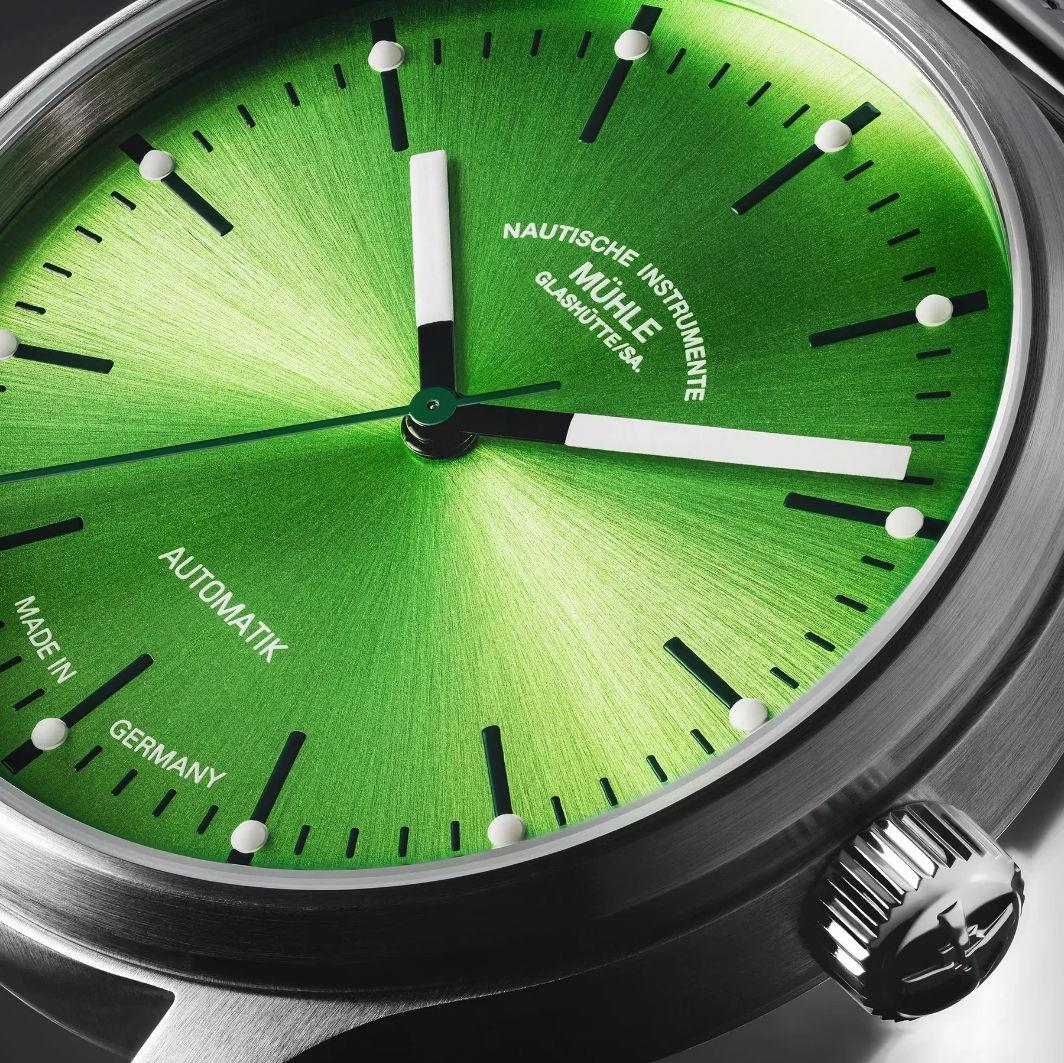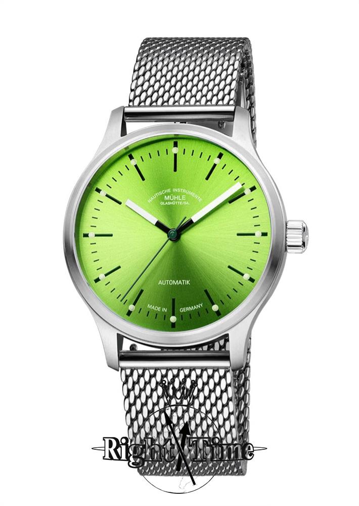 Muhle Glashutte Panova Lime model powered by 26 jewels SW200 movement with Glashutte made plates and patented woodpecker regulator. 40mm brushed stainless steel case, scratchproof sapphire crystal, screw down crown, lime color dial with luminous hands and markers. Comes on steel bracelet