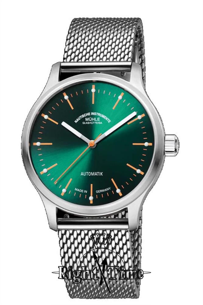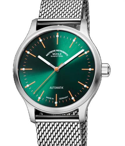 Muhle Glashutte Panova Green model powered by 26 jewels SW200 movement with Glashutte made plates and patented woodpecker regulator. 40mm brushed stainless steel case, scratchproof sapphire crystal, screw down crown, green color dial with orange accents and luminous hands and markers. Comes on bracelet