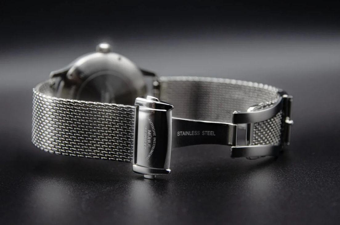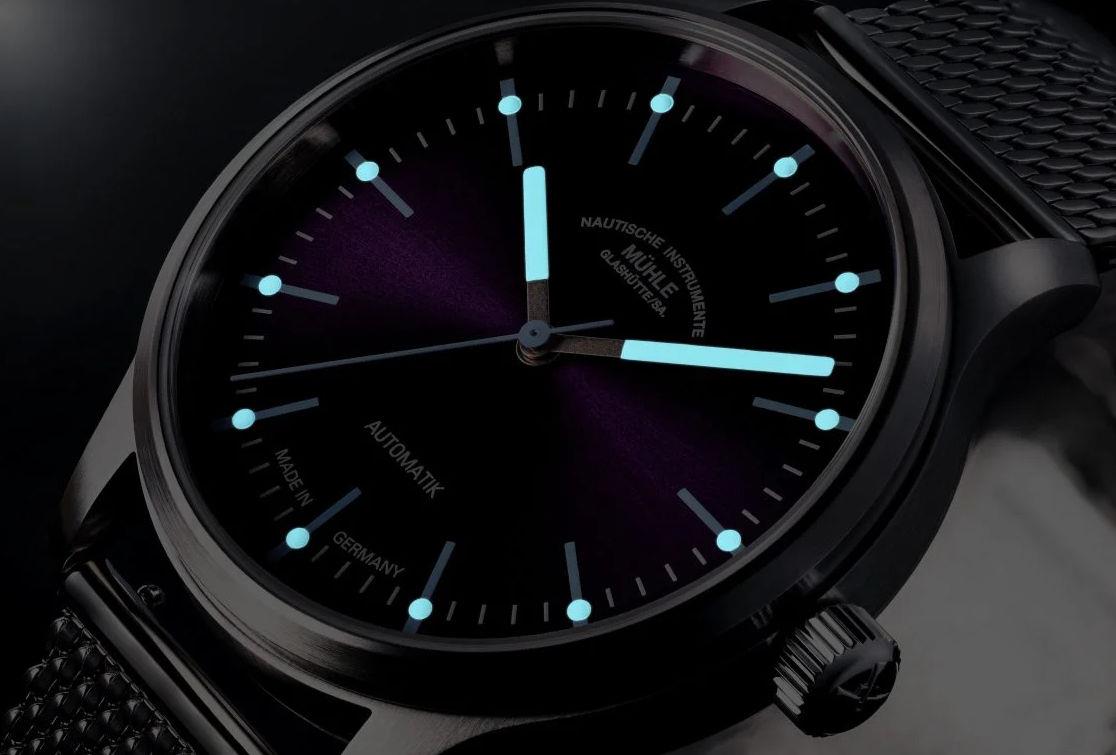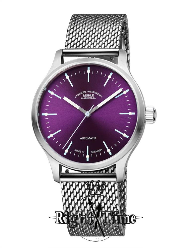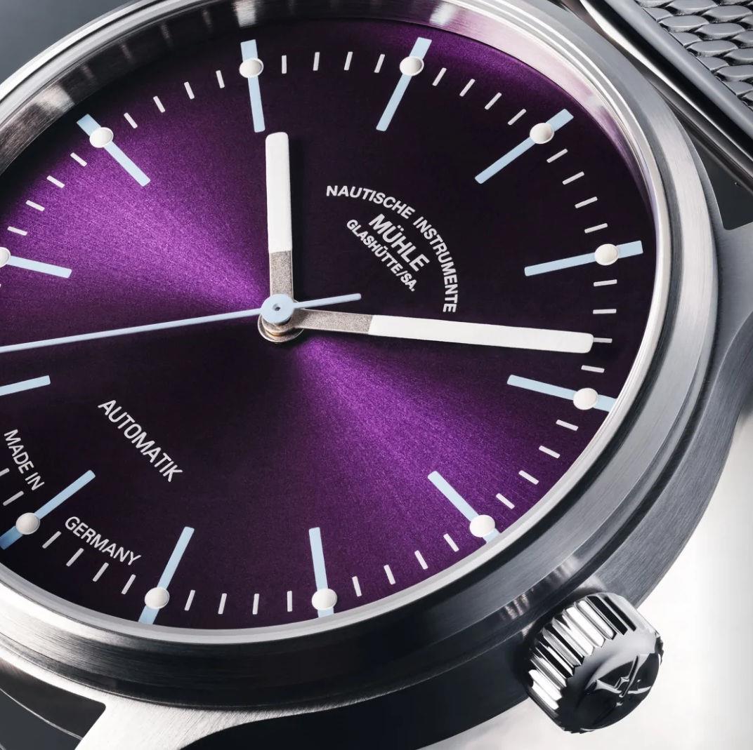 Muhle Glashutte Panova Violet model powered by 26 jewels SW200 movement with Glashutte made plates and patented woodpecker regulator. 40mm brushed stainless steel case, scratchproof sapphire crystal, screw down crown, violet color dial with luminous hands and markers. Comes on steel bracelet