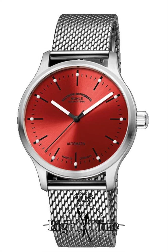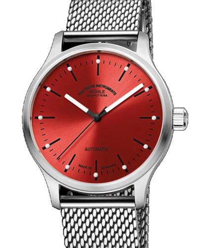 Muhle Glashutte Panova Red model powered by 26 jewels SW200 movement with Glashutte made plates and patented woodpecker regulator. 40mm brushed stainless steel case, scratchproof sapphire crystal, screw down crown, red color dial with black accents and luminous hands and markers. Comes on bracelet
