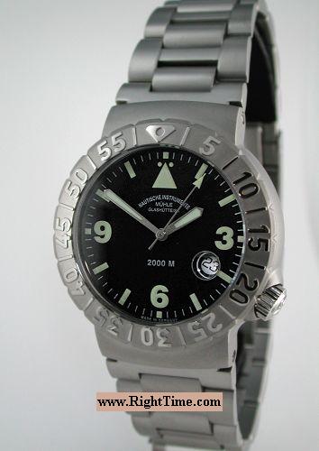 Muhle Natusche Instrumente from Glashutte SA deep divers model - 6,561 feet water resistant. Powered by most popular ETA Cal. 2824-2 25 jewels Swiss Automatic movement with Date calendar. Black dial with extra large luminous markers and hands. Extra large and easy to rotate with dive gloves unidirectional bezel. Stainless steel case and watch bracelet with tri-fold clasp and security flip-lock and over-the-wetsuit expansion.