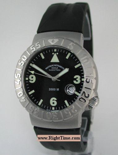 Muhle Natusche Instrumente from Glashutte SA deep divers model - 6,561 feet water resistant. Powered by most popular ETA Cal. 2824-2 25 jewels Swiss Automatic movement with Date calendar. Black dial with extra large luminous markers and hands. Extra large and easy to rotate with dive gloves unidirectional bezel. Stainless steel case, rubber watch band with tri-fold clasp and security flip-lock and over-the-wetsuit expansion.