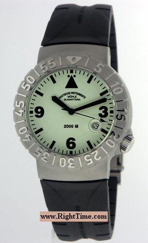 Muhle Natusche Instrumente from Glashutte SA deep divers model - 6,561 feet water resistant. Powered by most popular ETA Cal. 2824-2 25 jewels Swiss Automatic movement with Date calendar. Most readable under water all luminous dial with extra large luminous markers and extra large contrasting all black markers and hands. Extra large and easy to rotate with dive gloves unidirectional bezel.