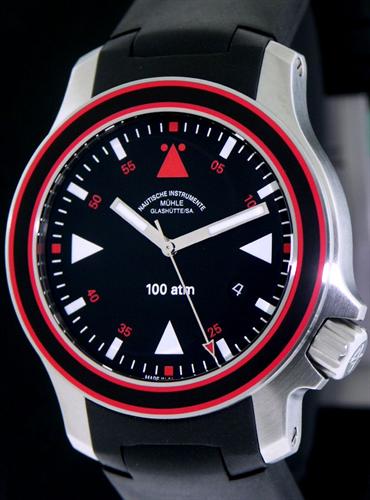 Celebrating 10th Anniversary of the best selling model of Natusche Instrumente from Glashutte SA made in collaboration with Search and Rescue captains is this 250 piece limited edition M1-41-43kb model. Powered by most popular Sellita SW200 26 jewels Swiss Automatic movement with calendar inside 44mm satin finish steel 1000m water resistant case. Easy to read flat black dial with extra large luminous red markers and extra large red luminous filled hands. Very comfortable and flexible rubber strap with steel sport buckle.
