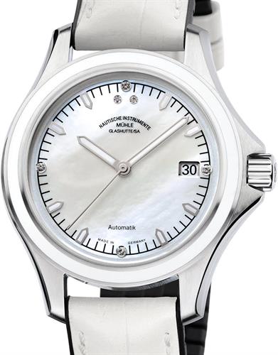 Muhle Glashutte ProMare Datum watch powered by automatic movement with Glashutte made plates and patented woodpecker regulator. Classic 39mm stainless steel case, scratchproof sapphire crystal, screw down crown, see-through caseback, white Mother-of-Pearl dial, Super-luminova hands and markers, date calendar. Water resistant to 300 meters. Comes on white and black strap