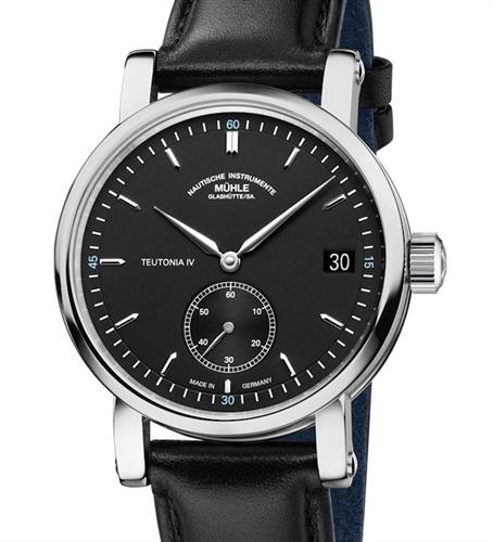 New Muhle Glashutte Teutonia IV German made wrist watch model M1-44-43-LB Small Second. Powered by SW 461-1 movement. Muhle version with woodpecker neck regulation, their own rotor and surface finishes. Black dial with applied silver polished indexes. Satin and polish finished steel case with screw down polished bezel and case-back. Black leather strap with deployant clasp.