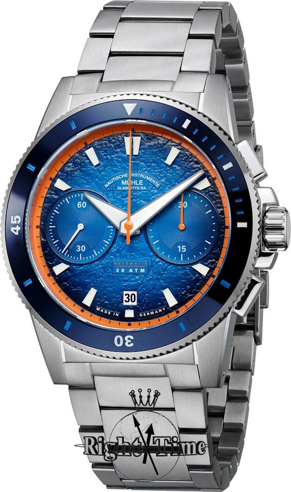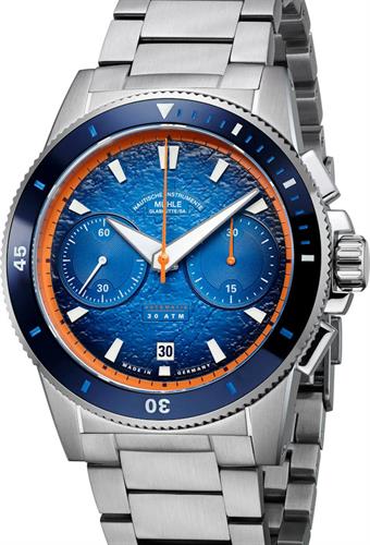 Muhle Glashutte Sportivo Active Chronograph model M1-52-02-MB. Powered by MU 9419 automatic movement. Steel case is brushed and polished finished. Comes on a bracelet with scratchproof sapphire crystal, screw down crown, blue color dial, and 0-60 bezel.