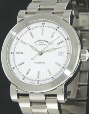 Muhle Glashutte wrist watch model M1-99-41MB from Muhle Glashutte City Line. Screw-down crown and case back, 25 jewel Swiss ETA 2824-2 movement, white Guilloche textured dial with date calendar, metal watch bracelet with spring loaded deployant clasp