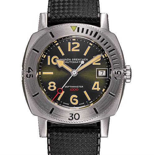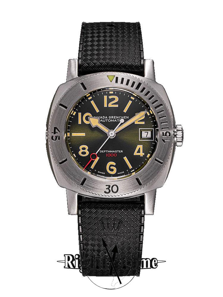 Nivada Grenchen Depthmaster Numerals Date. Model 14103A01. Steel case with 0-60 rotating bezel. Black Tropic rubber strap. Green dial. Water resistant to 1000 meters. Powered by automatic movement.