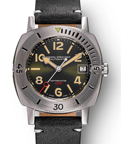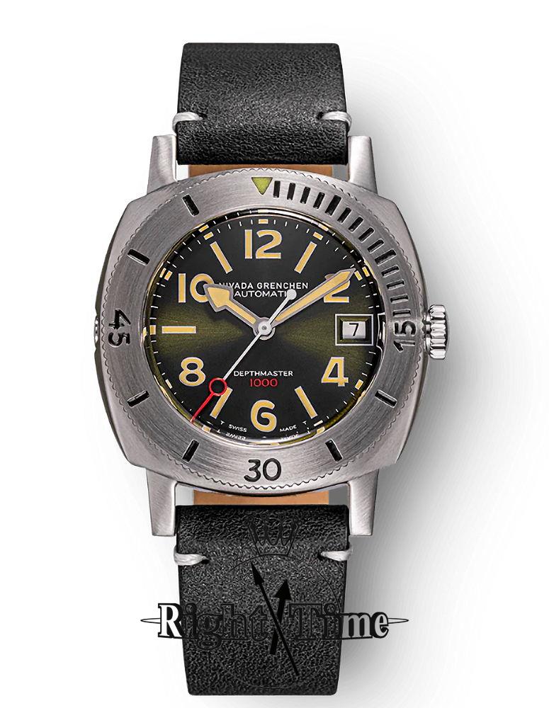 Nivada Grenchen Depthmaster Numerals Date. Model 14103A09. Steel case with 0-60 rotating bezel. Black leather strap. Green dial. Water resistant to 1000 meters. Powered by automatic movement.