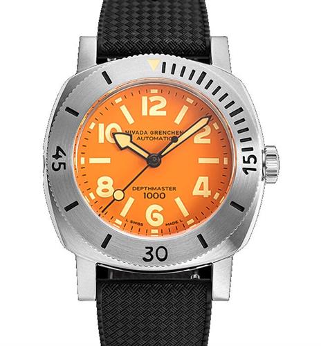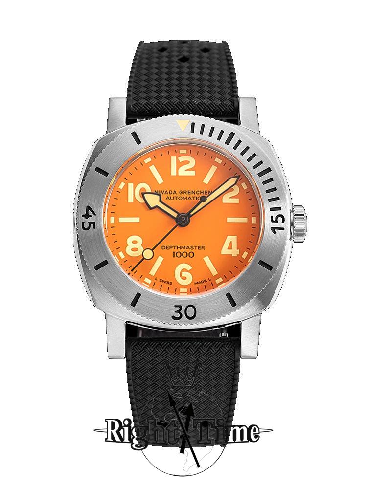 Nivada Grenchen Depthmaster Numerals Date. Model 14127A01. Steel case with 0-60 rotating bezel. Black Tropic rubber strap. Orange dial. Water resistant to 1000 meters. Powered by automatic movement.