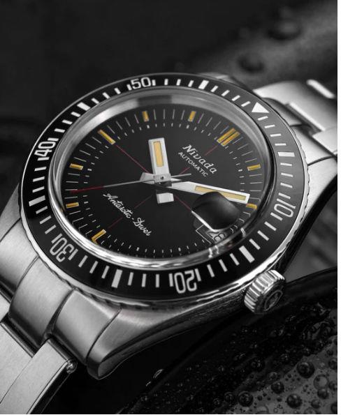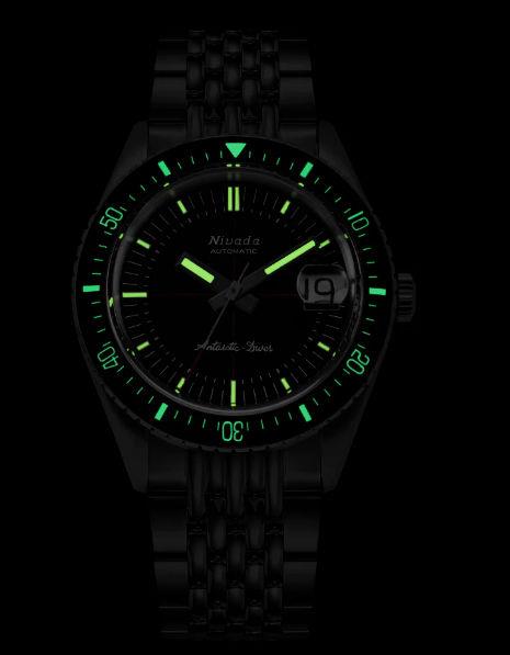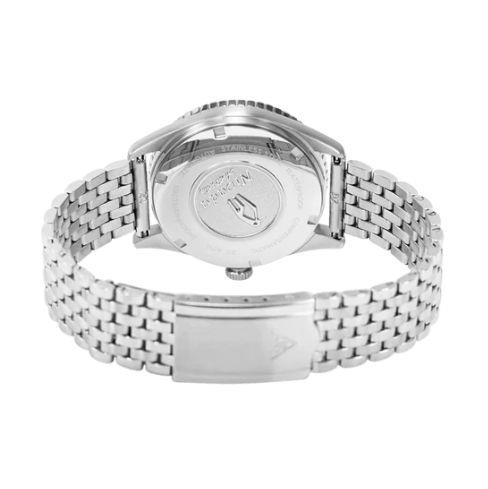 Nivada Grenchen Antactic Diver Model 32038A04. Steel case and bracelet. Black dial. Water resistant to 200 meters. Powered by automatic movement.