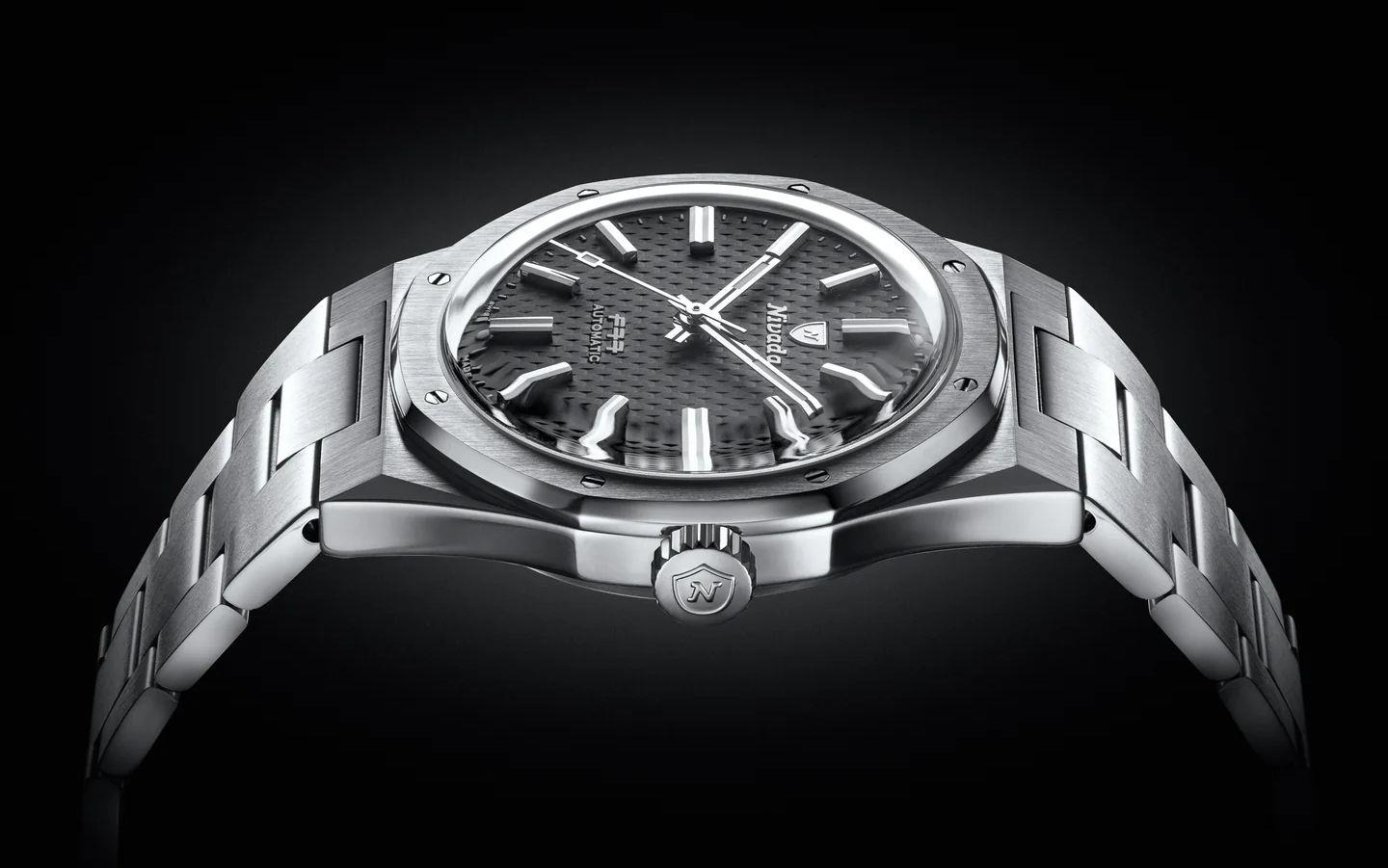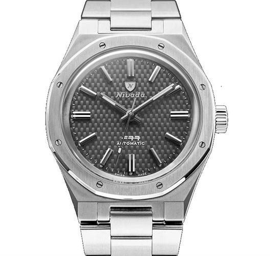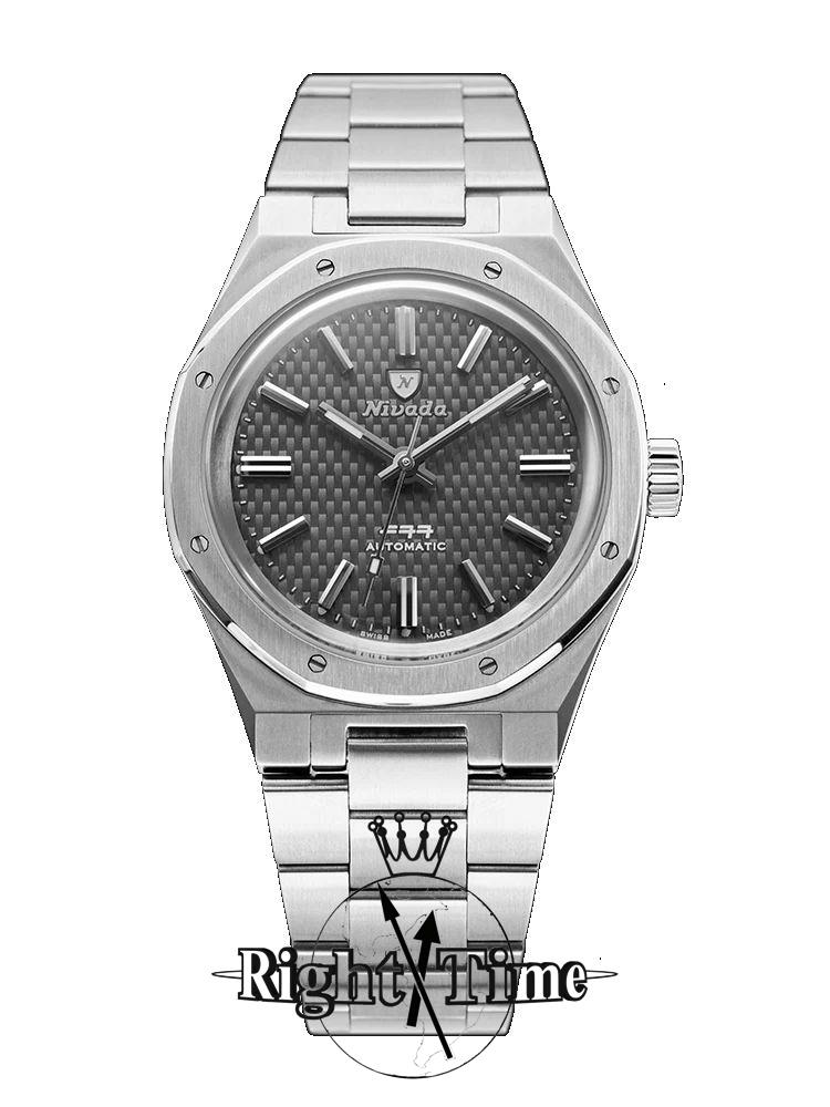 Nivada Grenchen F77. Model 68006A77. Titanium case and bracelet. Grey anthracite color dial. Water resistant to 100 meters. Powered by automatic movement.