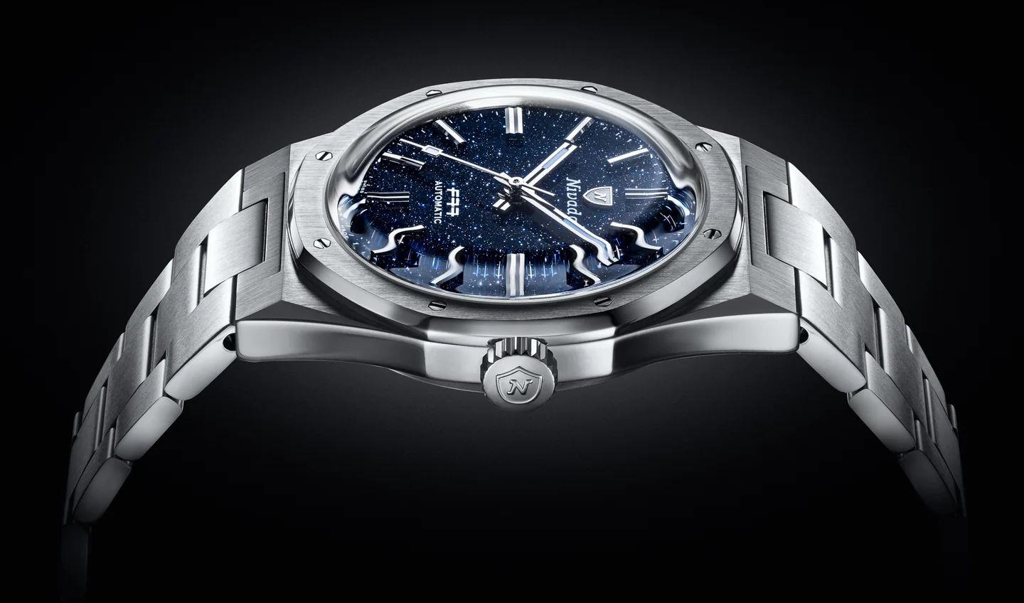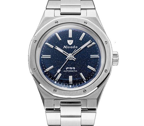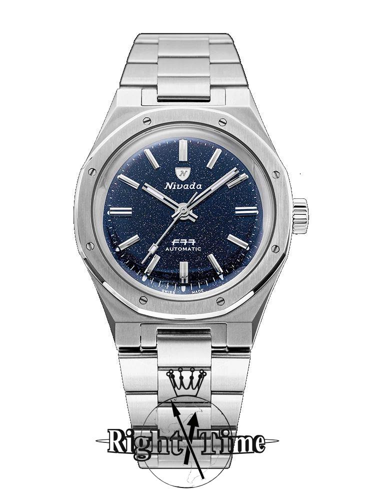 Nivada Grenchen F77 Aventurine. Model 68010A77. Stainless steel case and bracelet. Dark blue aventurine dial. Water resistant to 100 meters. Powered by automatic movement.