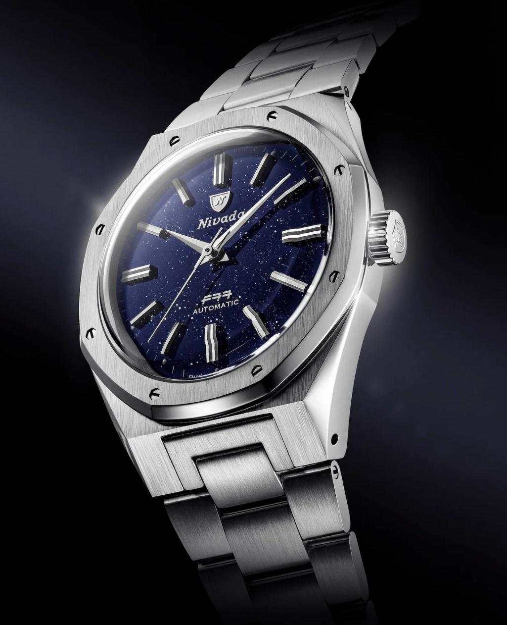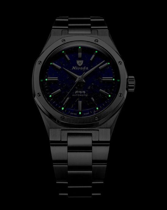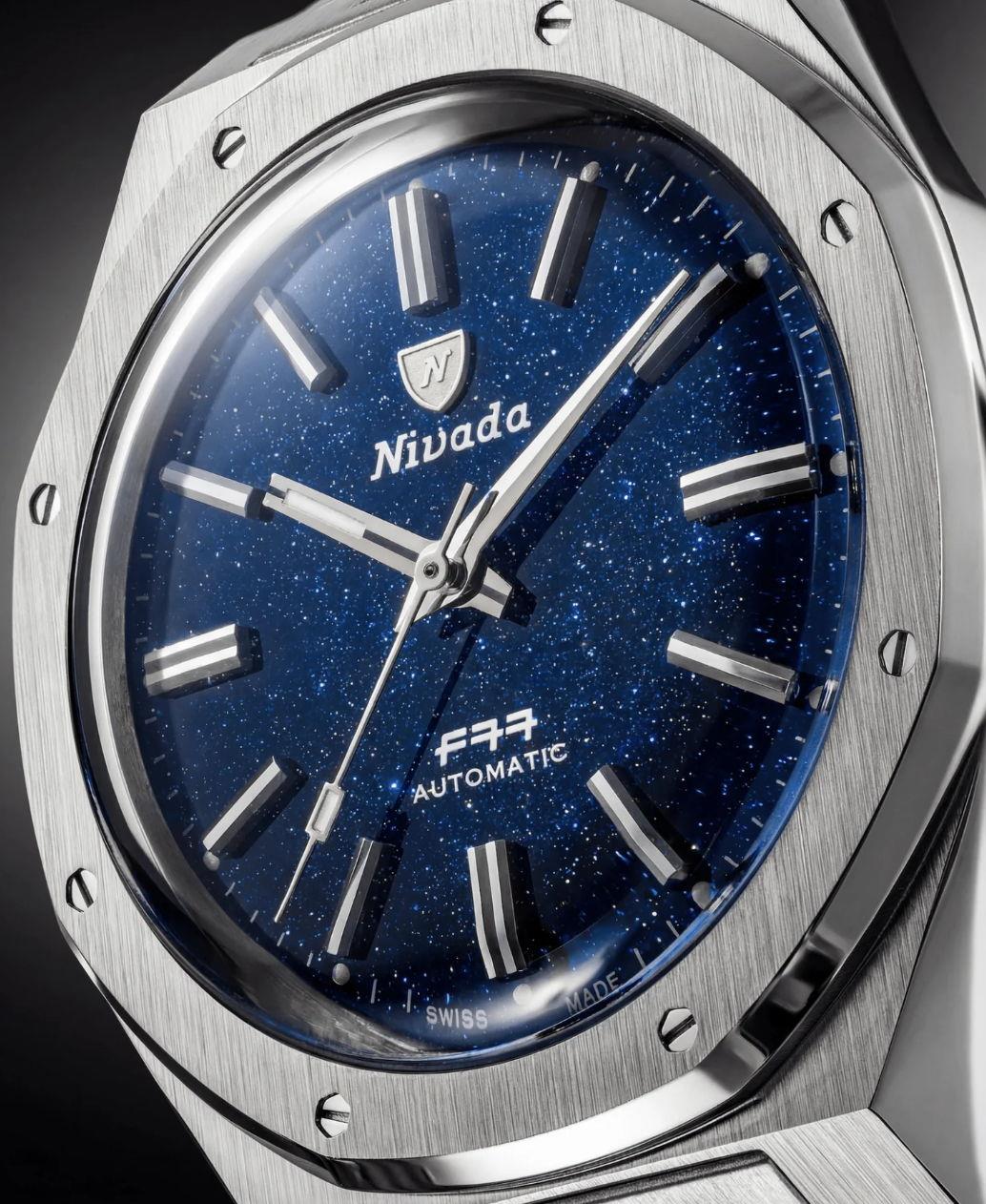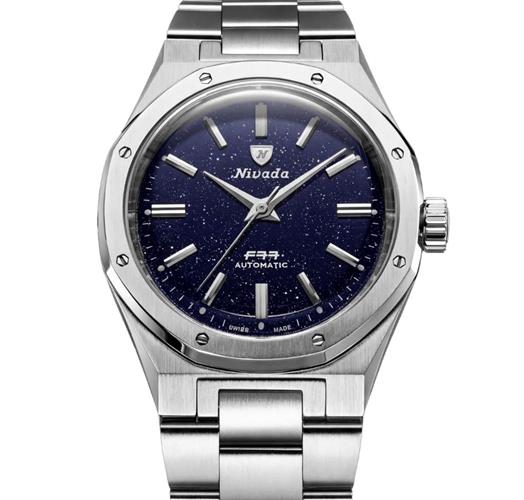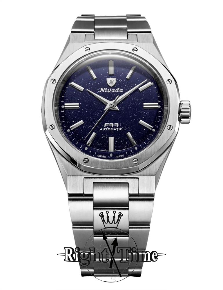 Nivada Grenchen F77 MKII Dark Blue Aventurine. Model 68047A77. Stainless steel MKII case and bracelet. Blue genuine aventurine stone dial with natural sparkling inclusions. Water resistant to 100 meters. Powered by automatic movement.