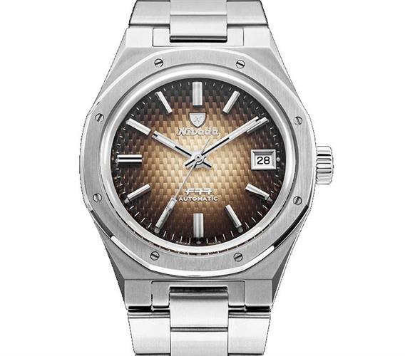 Nivada Grenchen F77 Brown Smoked with Date. Model 69002A77. Stainless steel case and bracelet. Brown dial with Smoked Embossed Carbon pattern. Water resistant to 100 meters. Powered by automatic movement.