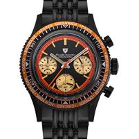 Nivada Grenchen Chronoking Mecaquartz model 87041Q04. Black PVD plated stainless steel case and bracelet. Matt black with gradient orange and super 1345C luminescence. Water resistant to 100 meters. Powered by quartz chronograph movement.