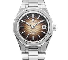 Nivada Grenchen F77 Brown Smoked with Date. Model 69002A77. Stainless steel case and bracelet. Brown dial with Smoked Embossed Carbon pattern. Water resistant to 100 meters. Powered by automatic movement.