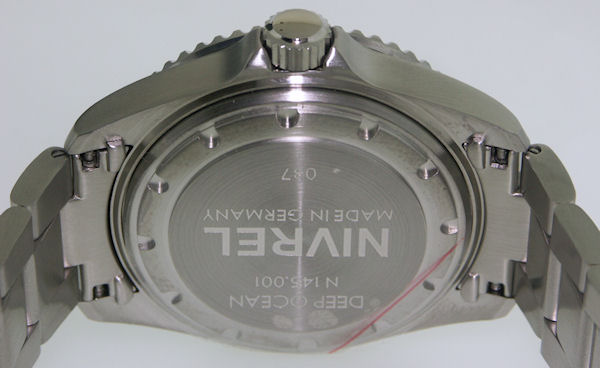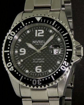 Nivrel "Deep Ocean" N145.001CASMB model from Nivrel Diving Watches Collection. 500 meters water resistant. Swiss ETA Cal. 2824-2 Automatic movement with date calendar. Black carbon fiber dial with large luminous markers. Stainless steel case with observation crystal, uni-directional 0-60 rotating bezel, screw-down crown and case back. Stainless steel watch bracelet with deployant buckle and security clasp with band extension so it can be worn over a diving suit.