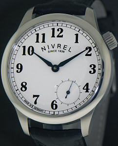 Nivrel manual wind wrist watch powered by ETA 6498 movement with swan`s neck fine adjustment. Large 42mm steel 316L case with transparent back, white enamelled looking dial with large Arabic numerals. Small seconds sub-dial at 5 o`clock position. Black leather watch strap.