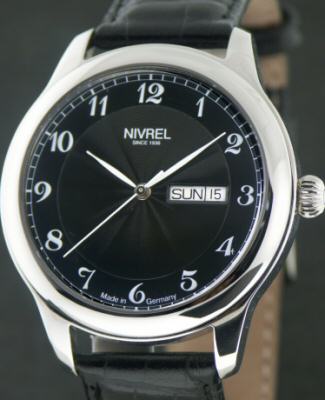 Nivrel dress wrist watch with large stainless steel polished case, black Guilloche sunburst dial and white Arabic numerals, operated by highly decorated 25 jeweled Swiss ETA 2836-2 movement.