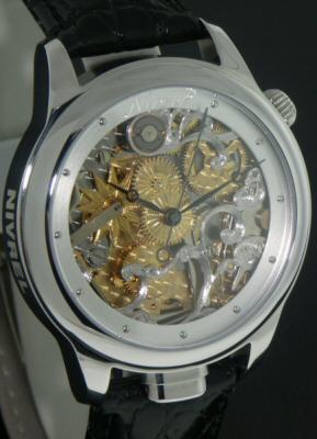 Swiss Automatic watch based on ETA 2892-A2 movement with a 5-minute repeater module from Dubois-Depraz reserved for NIVREL. Nivrel hand finishes only 10 skeleton movements per month. This movement was initially developed by Dubois Depraz, the module specialist from Le Lieu on Lac de Joux, in the late 80s for Kelek. As a Kelek distributor, Gerd Hofer of Nivrel, purchased all the movements when Kelek became part of Breitling.