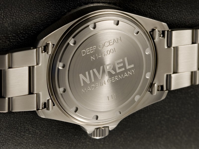 Nivrel "Deep Ocean" N145.001CASDB model from Nivrel Diving Watches Collection. 500 meters water resistant. Swiss ETA Cal. 2824-2 Automatic movement with date calendar. Black dial with large luminous markers. Stainless steel case with observation crystal, uni-directional 0-60 rotating bezel, screw-down crown and case back. Stainless steel watch bracelet with deployant buckle and security clasp with band extension so it can be worn over a diving suit.