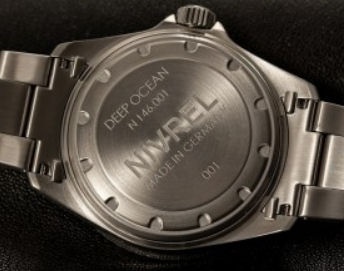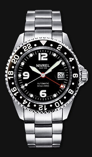 Nivrel "Deep Ocean" N146.001CASDB model from Nivrel Diving Watches Collection. 500 meters water resistant. Swiss ETA Cal. 2836-2 Automatic movement with date calendar and second time zone hand. Black dial with large luminous markers. Stainless steel case with observation crystal, uni-directional 0-60 rotating bezel, screw-down crown and case back. Stainless steel watch bracelet with deployant buckle and security clasp with band extension so it can be worn over a diving suit.