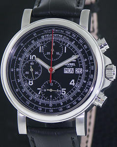 Nivrel Chronographe Replique III. Solid 316L stainless steel case with observation case back and screw-down crown. ETA/VALJOUX 7750 25 jewels Swiss Automatic chronograph movement with Cotes de Geneve enhancements. Black color dial with day/date calendar, tachymeter and telemeter scales, Arabic markers. Black leather watch band.