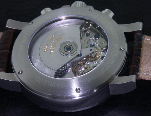 Nivrel Heritage Grand Chronographe. Solid 316L stainless steel case with observation case back and screw-down crown. ETA/VALJOUX 7750 25 jewels Swiss Automatic chronograph movement with Cotes de Geneve enhancements. Silver color dial with Clous de Paris guilloche texture and day/date calendar. Brown Lousiana Alligator leather band.